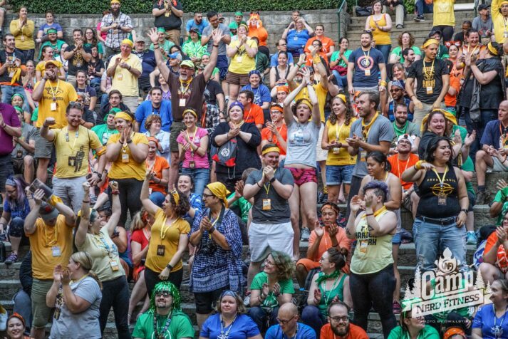 I laughed and shrugged it off, and then I looked around at one group of people training with swords, another group scaling a wall, another breaking boards, another playing board games, and hundreds rocking the Nerd Fitness logo on their chests, cheering for everybody with passion, and I realized something: