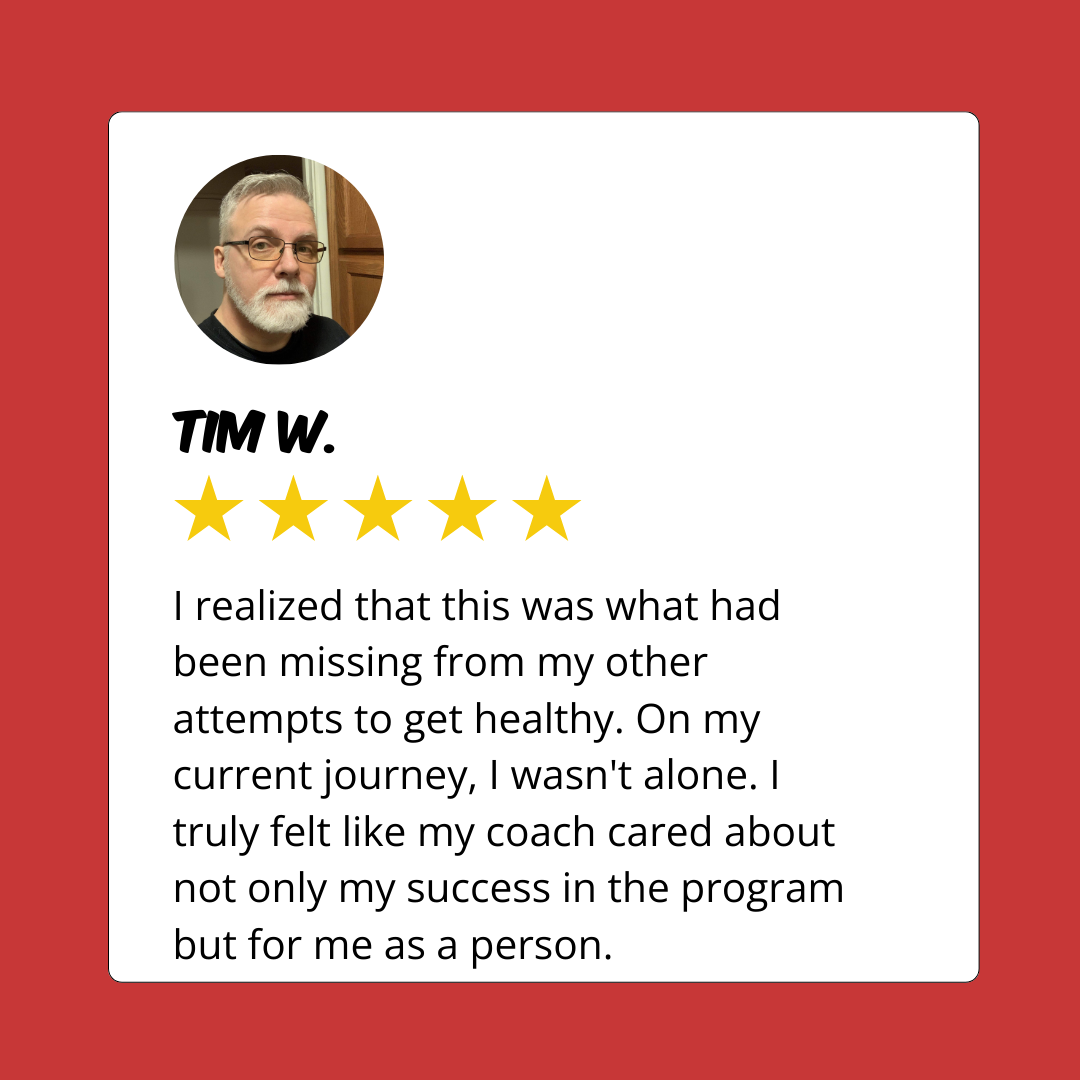 I had tried various programs but had gone through the yo-yo cycle of gain and loss many times. I was skeptical about trying another program because they all seemed similar and hadn’t worked in the past. Coach Mike was the perfect match for me. His attention and guidance kept me on track and focused throughout the past year and a half. I’m 74 years old but I feel like these are practices I can do for many years to come!